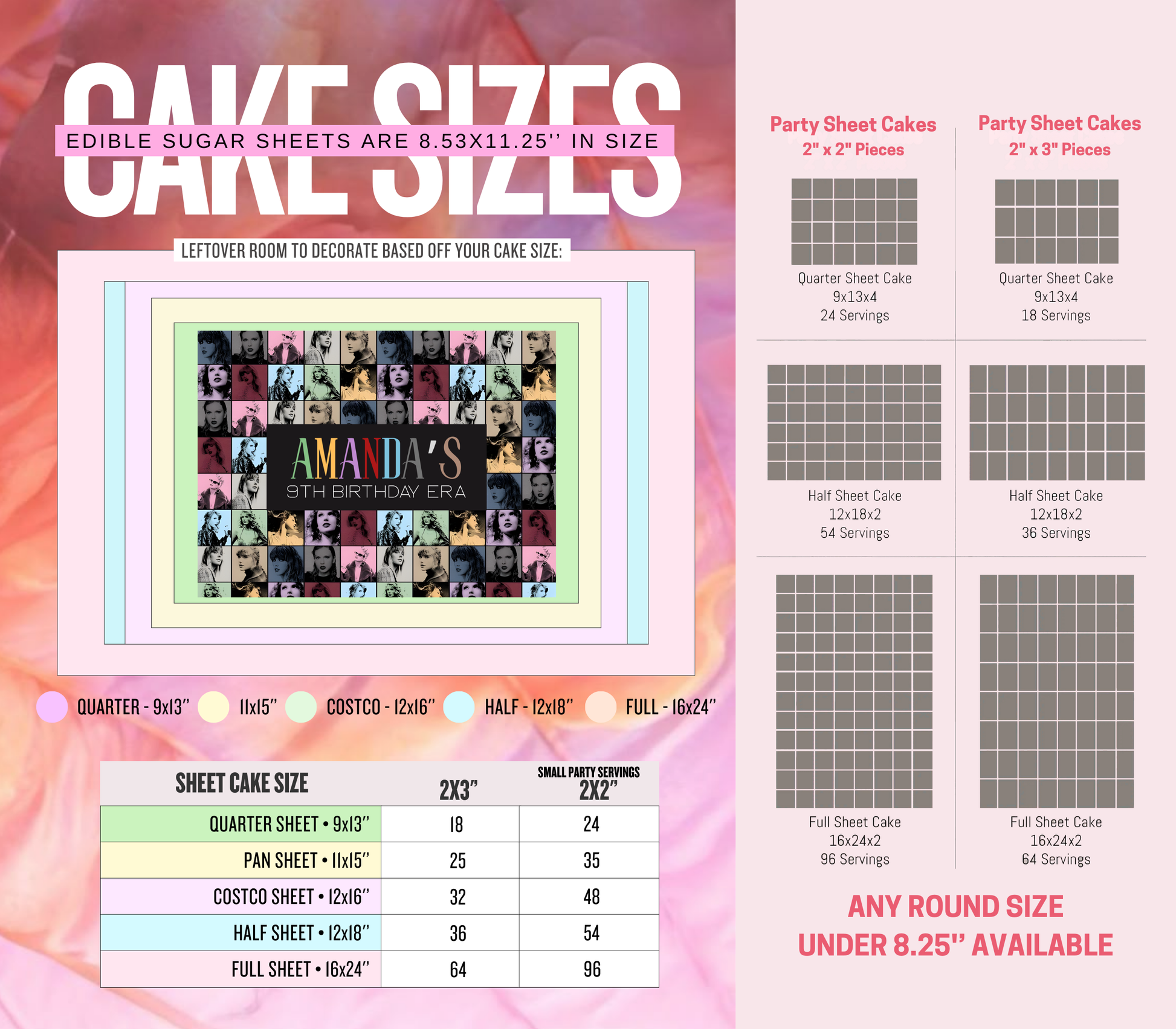 Fits a quarter sheet cake best, however can be used on any size at all! Check out the photo section for a cake size chart.