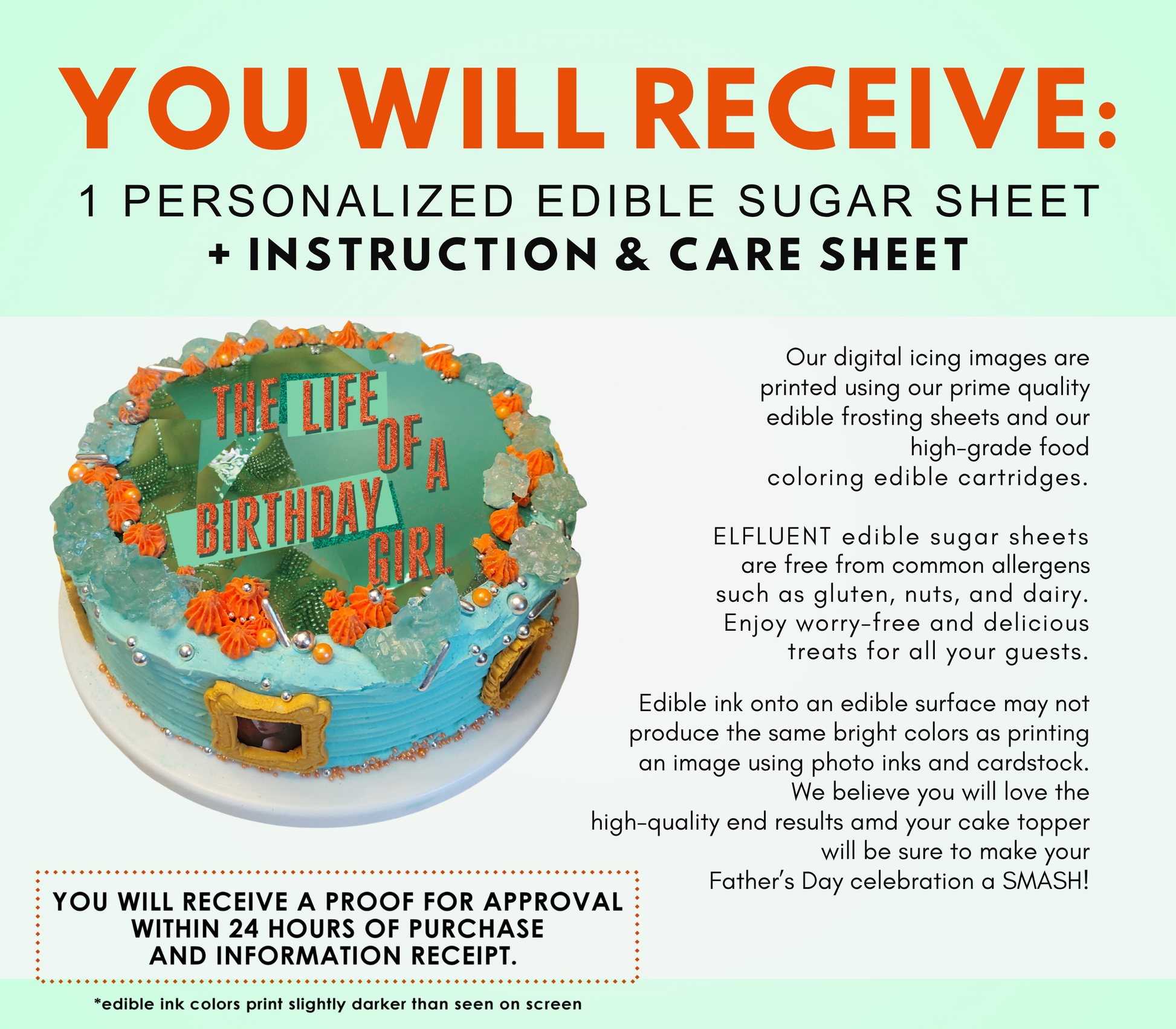 Printed with EFLUANT Edible Sugar Sheets and Ink. Edible Sugar Sheets are allergen-free, making them suitable for those with dietary restrictions. No need to worry about gluten, nuts, or dairy, as our products are carefully crafted to meet your needs.