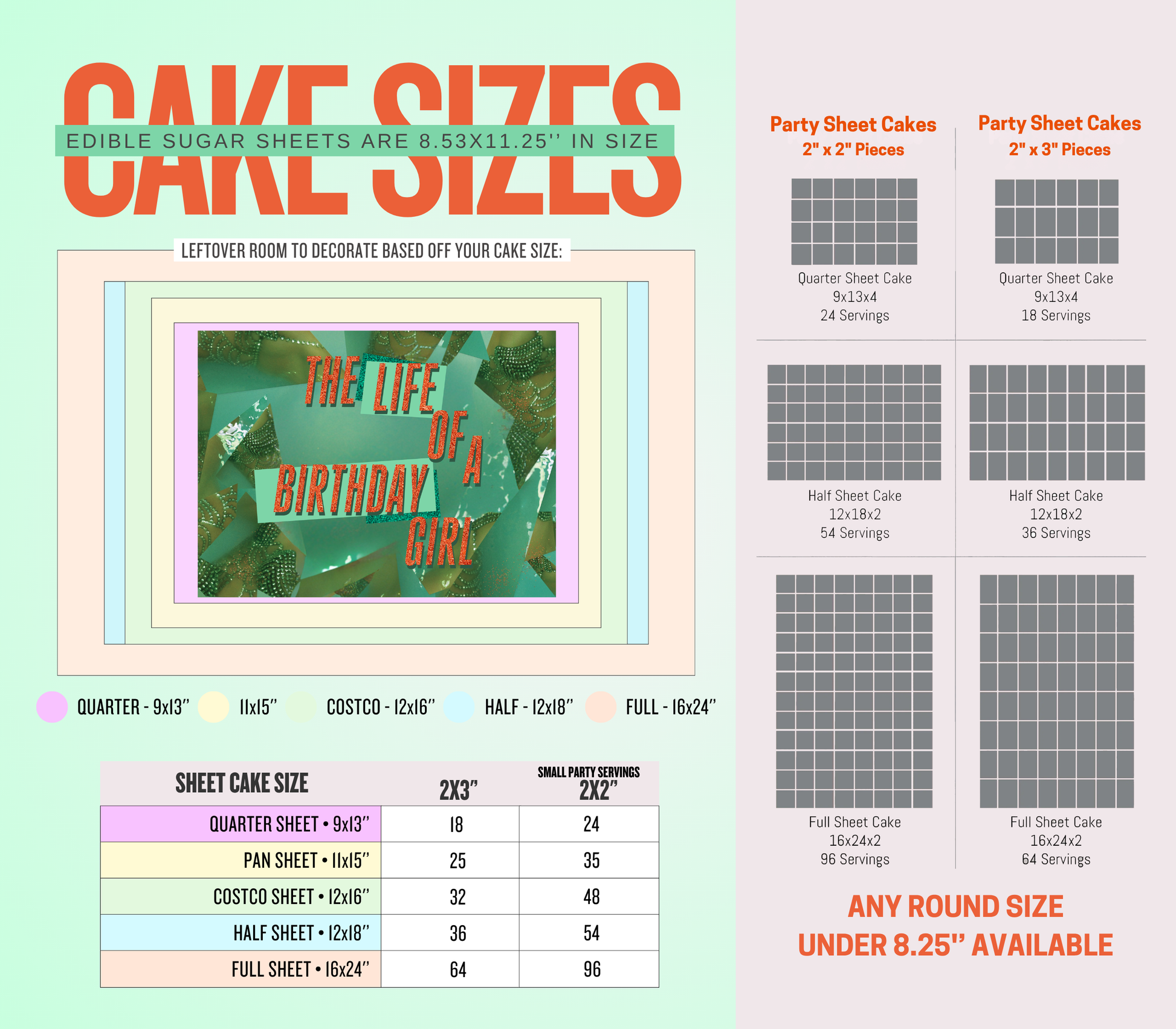 Fits a quarter sheet cake best, however can be used on any size at all! Check out the photo section for a cake size chart.